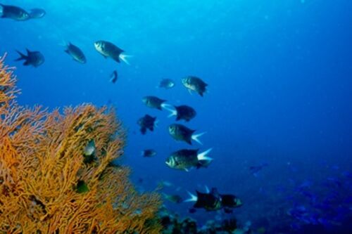 スズメダイ科のモンスズメダイは全長約15cmになり、千葉県以南の西部太平洋に分布している。体色は黒で、尾ビレが白い。サンゴ礁域の転石帯などに単独~数尾で生息している。 群がって生息するモンスズメダイ(座間味) 繁殖期は初夏から秋で、この時季オス…