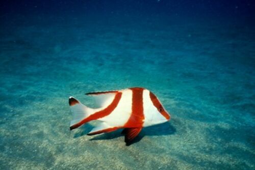 フエダイ科のセンネンダイは全長約70cmになり、和歌山県以南の西部太平洋、インド洋に分布している。白地に赤茶色の独特な縞模様があることから、容易にセンネンダイとわかる。だが、成魚になると消えるようだ。 全長約40cmのセンネンダイの若魚(鹿児島・坊…