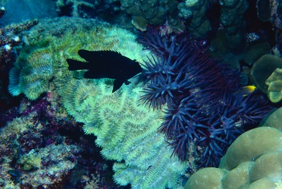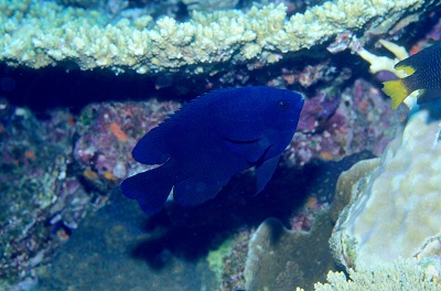 スズメダイ科のクロスズメダイは、奄美大島以南の西部太平洋、インド洋に分布する。全長約17cmになり、和名のとおり体色は黒い。正確にいうと、青味ががかった黒だ。やや内湾性で比較的浅いところに生息し、ウミキノコ類のソフトコーラルの近くにいることが多い。