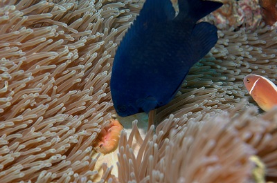本種は雑食性のようだが、実際にエサを食べている姿はあまり見られない。ところが、奄美で意外な行動を観察した。ハナビラクマノミが住むセンジュイソギンチャクのそばに来たのだ。触手には刺胞毒があるので、普通の魚は近づかない。
